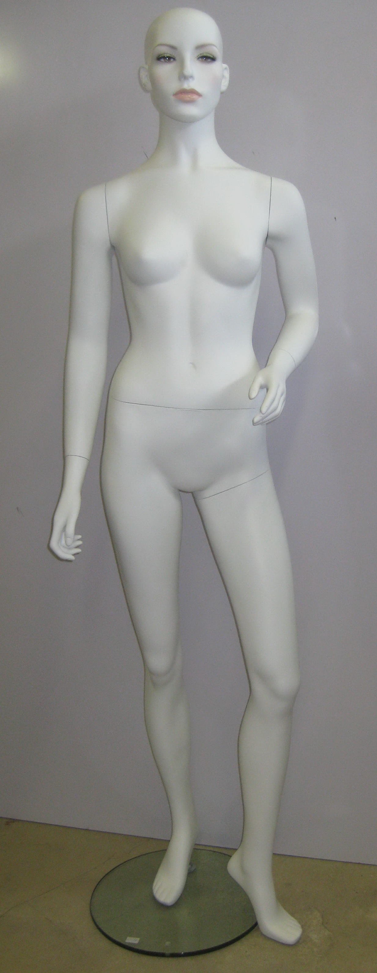 Woman mannequin of white colour, face with make-up, firm hair, the right leg forward. | Ladies mannequin body-plastic material | |