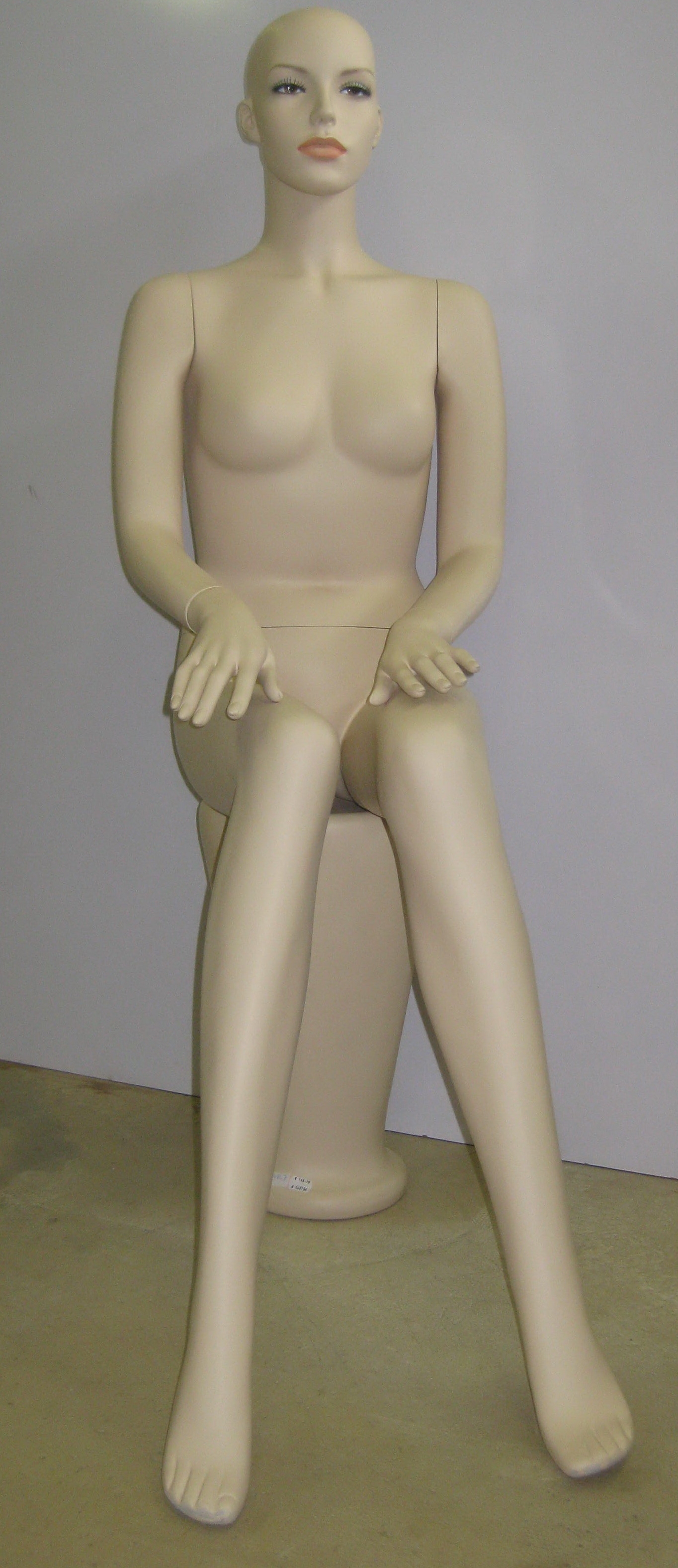 Woman mannequin of natural colour, face with make-up, firm hair, the right leg forward. | Woman mannequin of white colour without head and with the left leg forward. The basement is chrome-plated metal. | Woman mannequin of natural colour, face with make-up, firm hair, the right leg forward. |