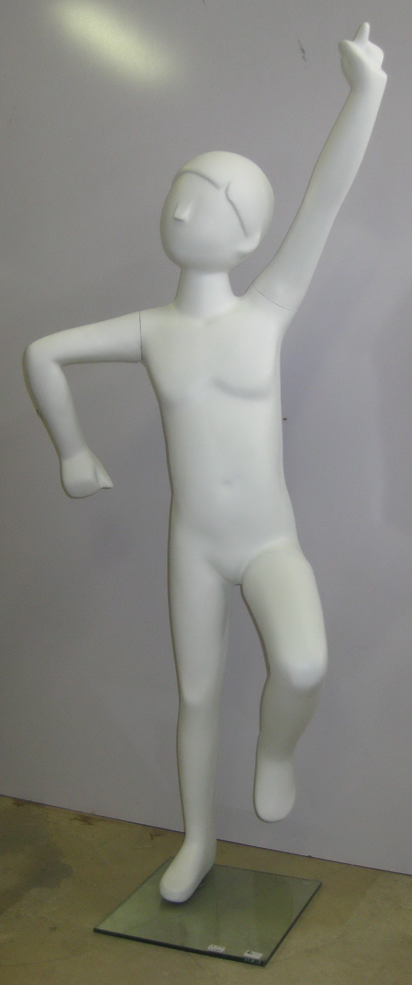 Detský manekýn, výška 1, 4m, biela farba, podstavec skleneny, tvár bez make-up, bez vlasy.