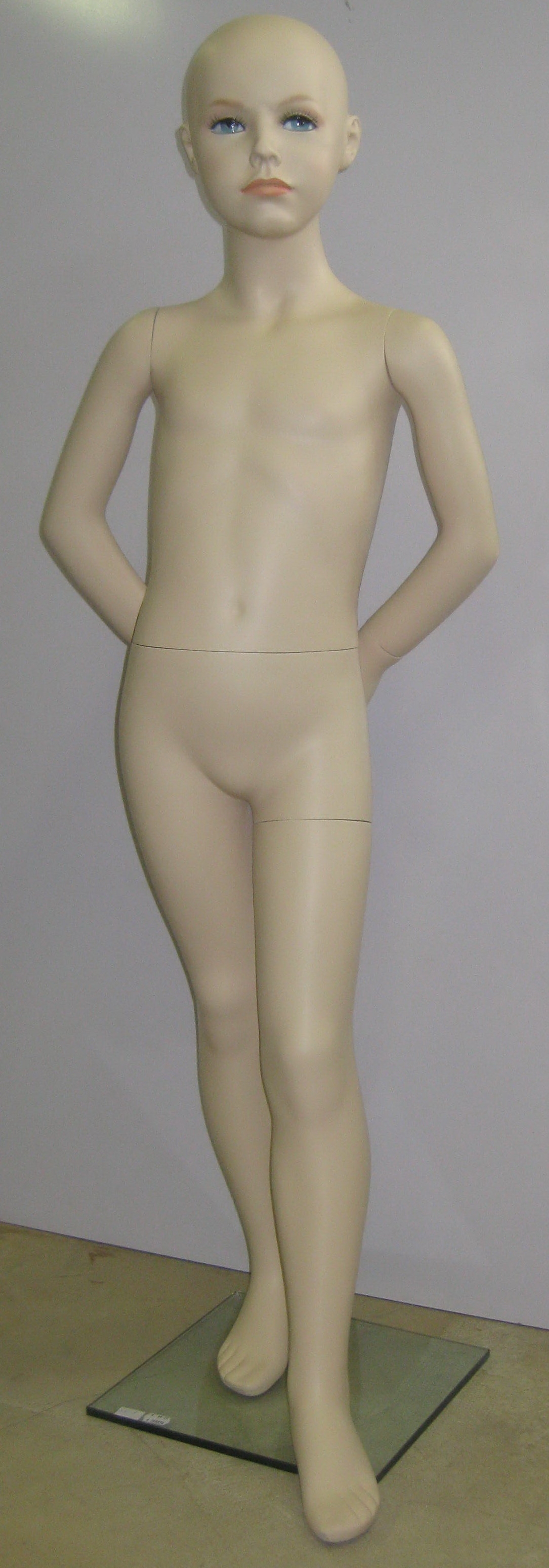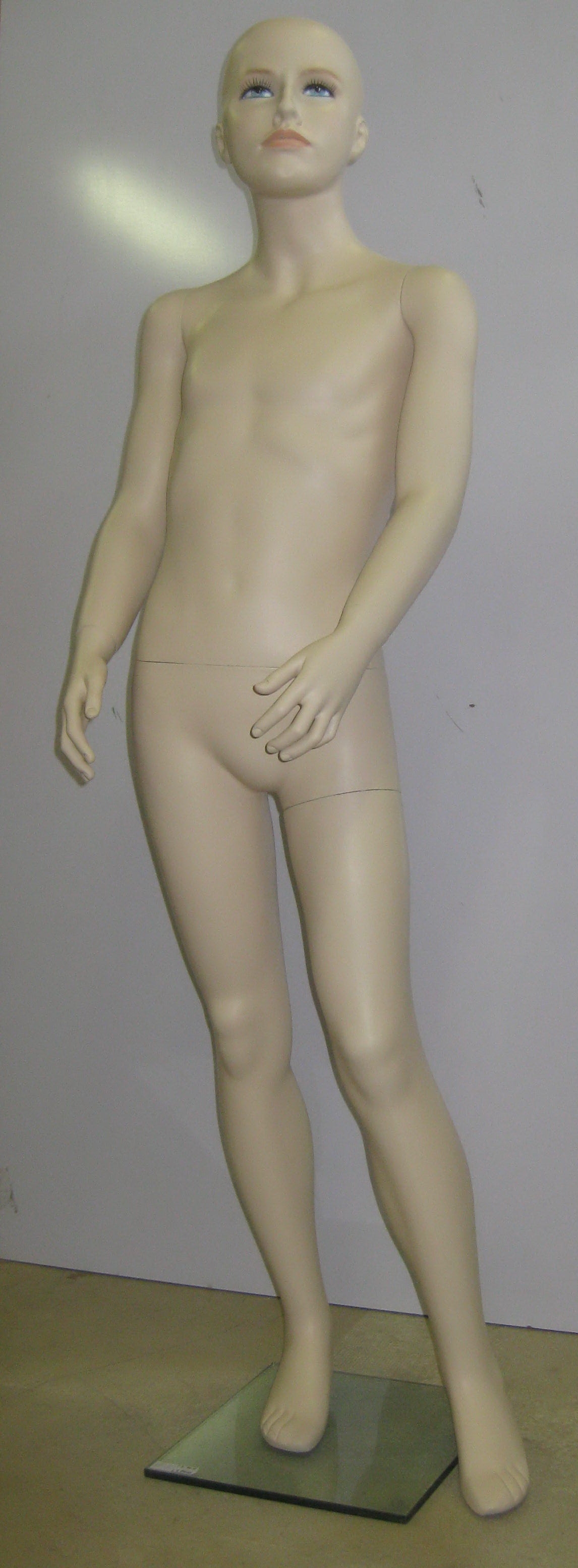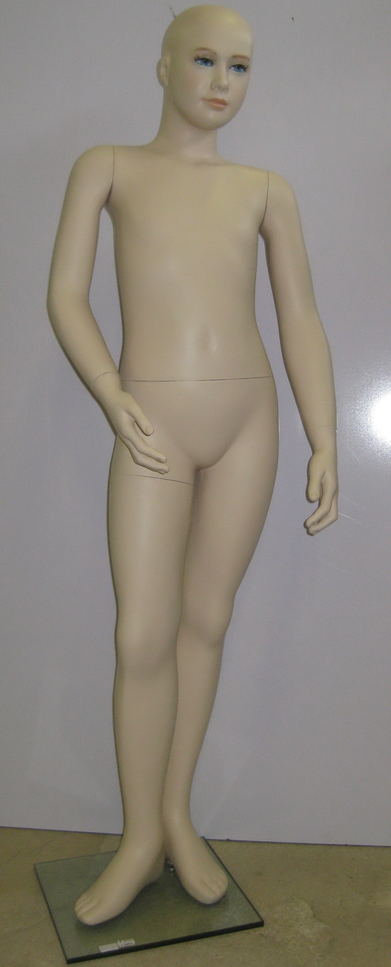 Detský manekýn, výška 1, 3m, biela farba, podstavec skleneny, tvár bez make-up, bez vlasy. | Detský manekýn, chlapec, výška 130cm, telová farba, sklenene podstavec, tvár s make-upom, bez vlasy. | Detský manekýn, dievča, výška 1, 2m, telová farba, podstavec skleneny, tvár má make-up, bez vlasy. |