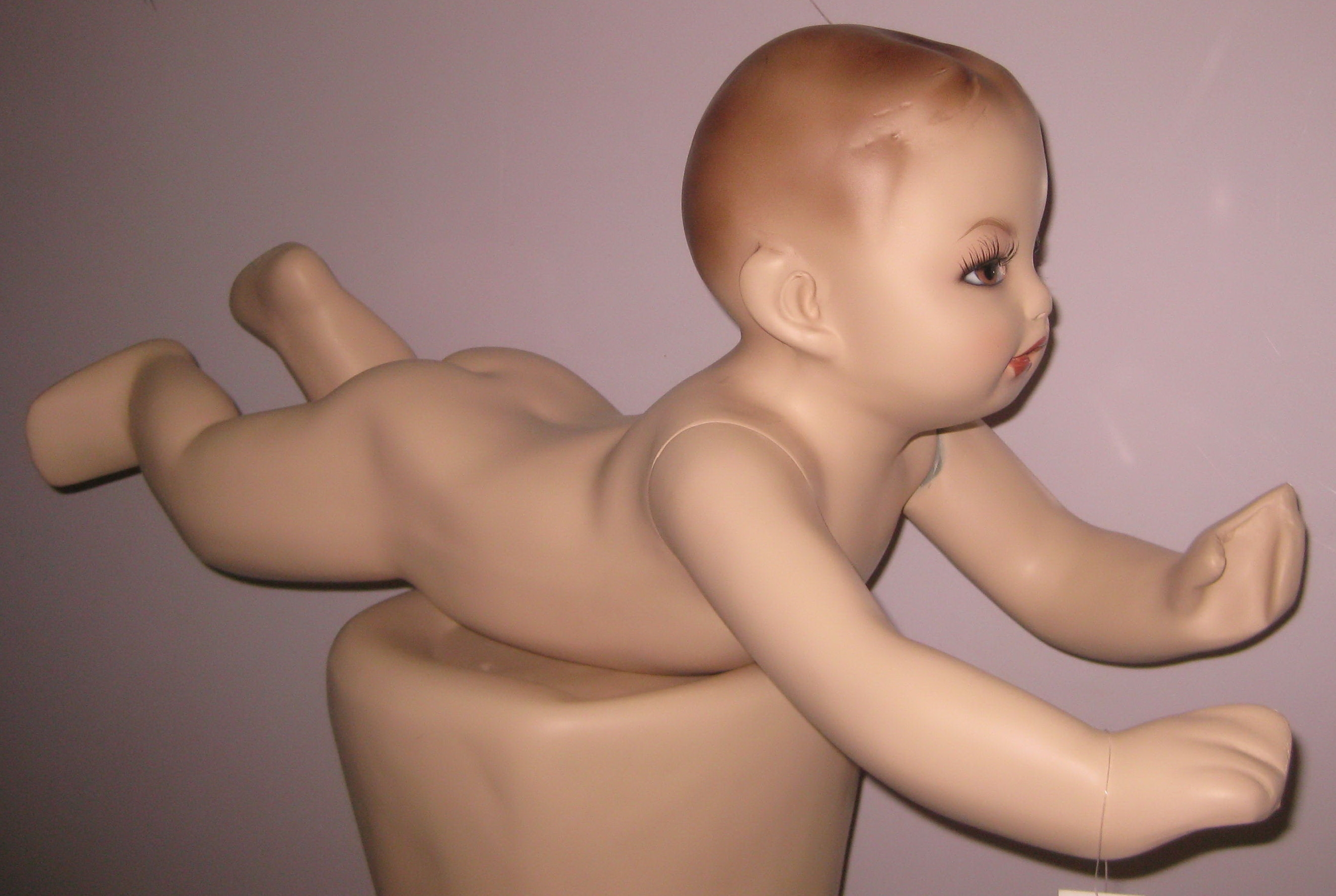 Detský manekýn, bábätko na kolenach výška 0, 6m, telová farba, tvár má make-up, pevné vlasy. | Detský manekýn, ležiace bábätko, telová farba, tvár má make-up, pevné vlasy. |