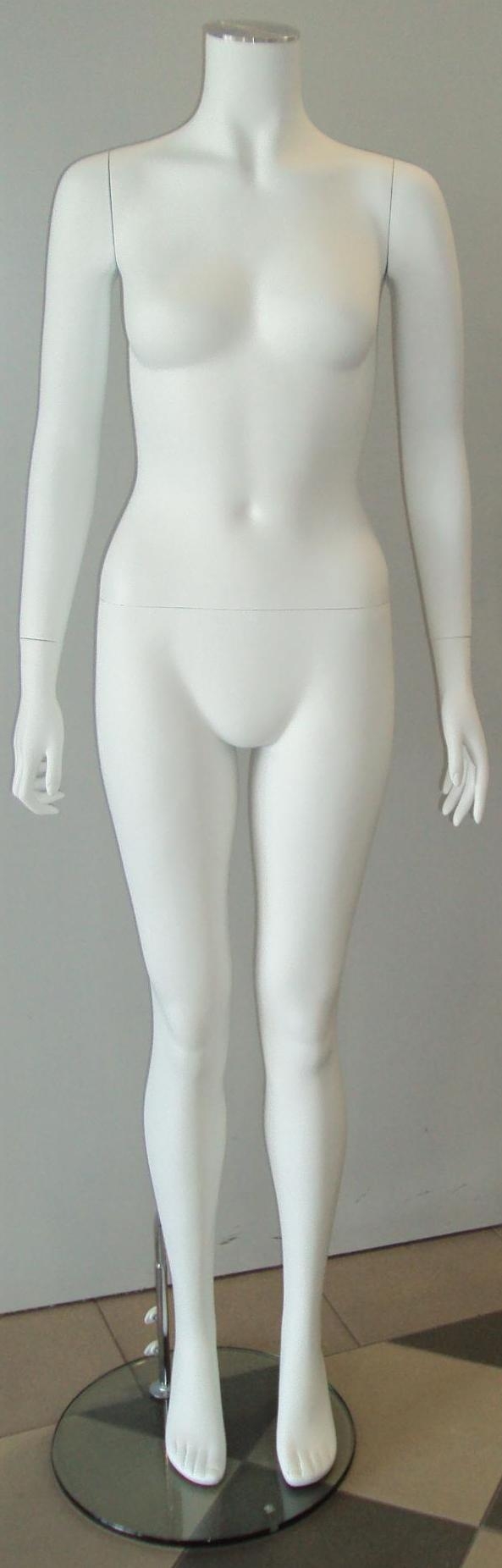 Dámska figurína-sediaca, telovej farby s hlavou, tvár s make-up, bez vlasov. | | Dámska manekýna biela bez hlavy, vykročená ľavá noha zo skleneným podstavcom. |