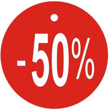 Papierové visačky guľaté s percentuálnou zľavou -50%, veľ. ?45mm, červená farba, balenie 100ks. | ||